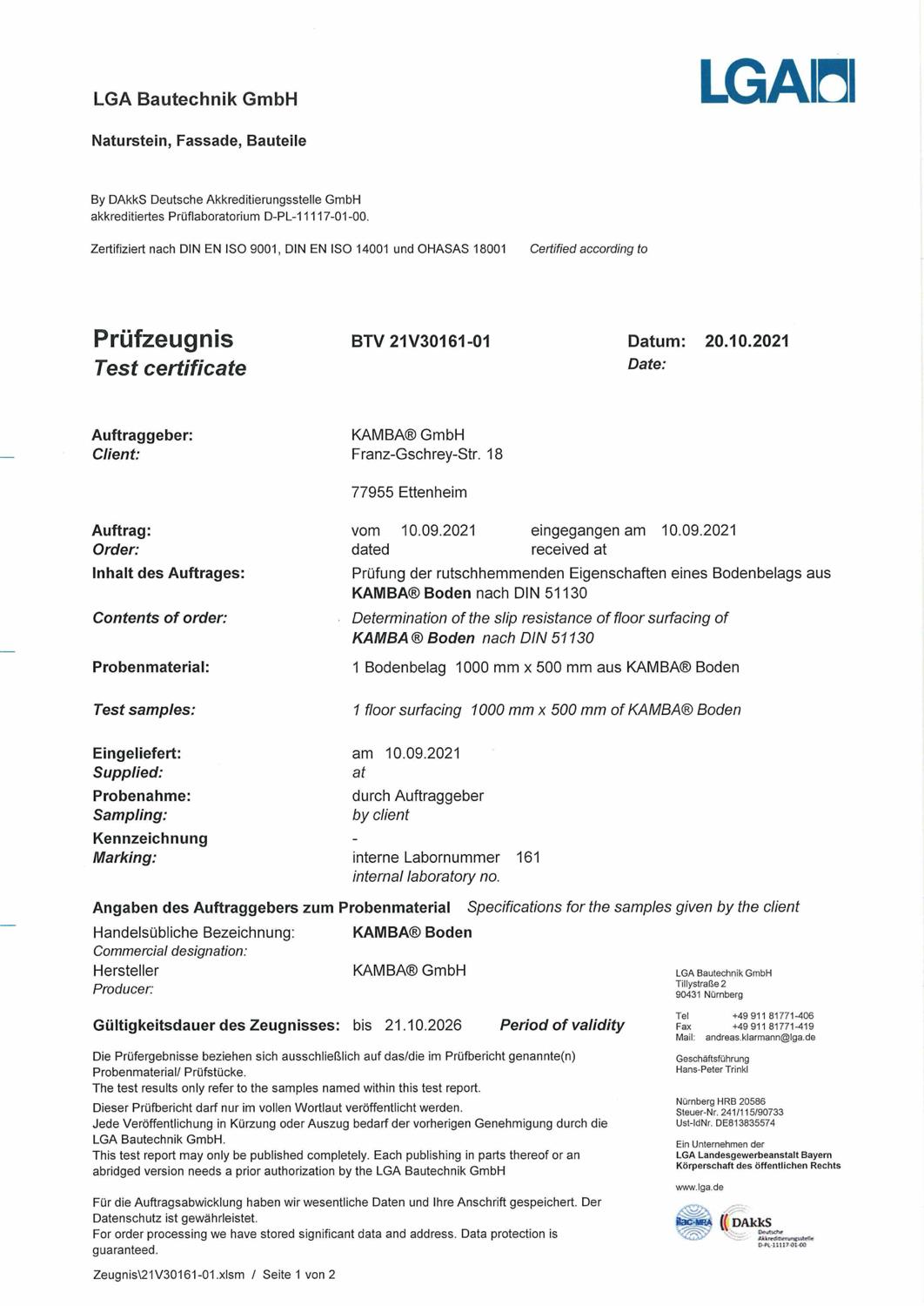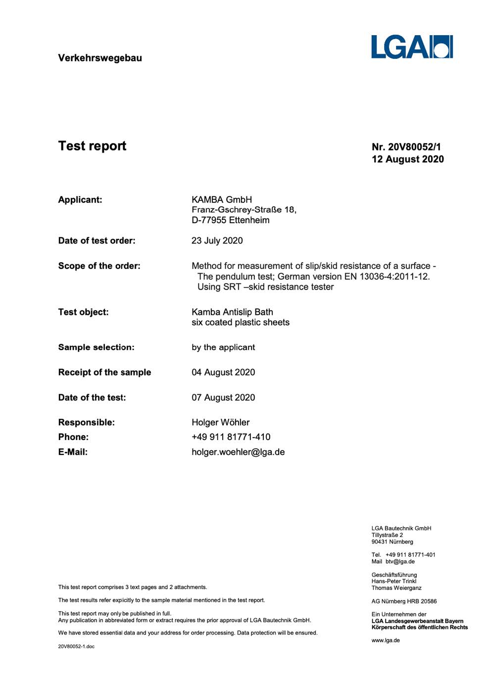 TÜV Rheinland/LGA 以其在產品與服務檢測認證領域的專業知識享譽全球。該機構對KAMBA 防滑塗層的認證,